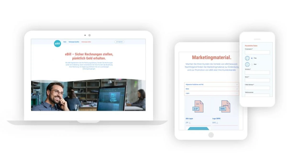 Wir wollten eine moderne Webplattform, die informiert statt überfordert. Nutzer:innen sollten sofort verstehen, was eBill ist, wie sie es nutzen können, sich direkt anmelden oder Marketingmaterial anfordern können. Die Seite musste auch Unternehmen überzeugen, eBill in ihre Prozesse zu integrieren.