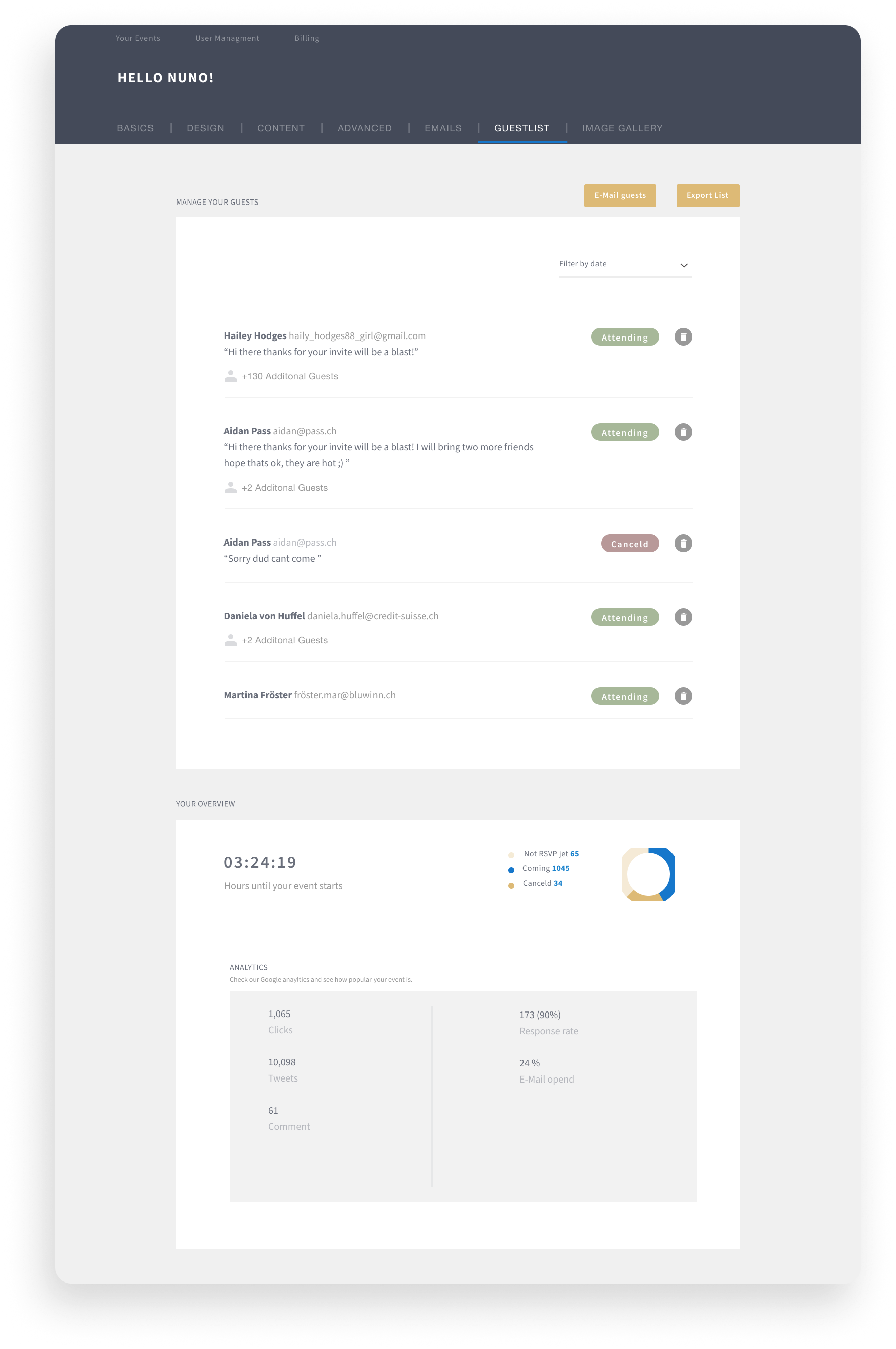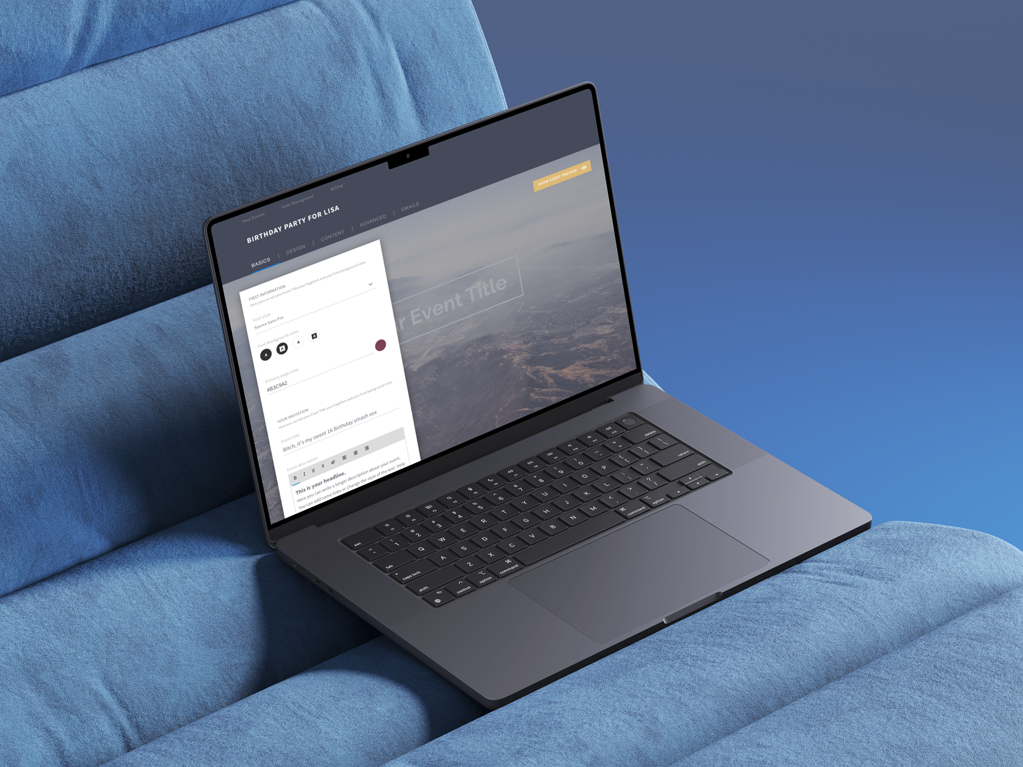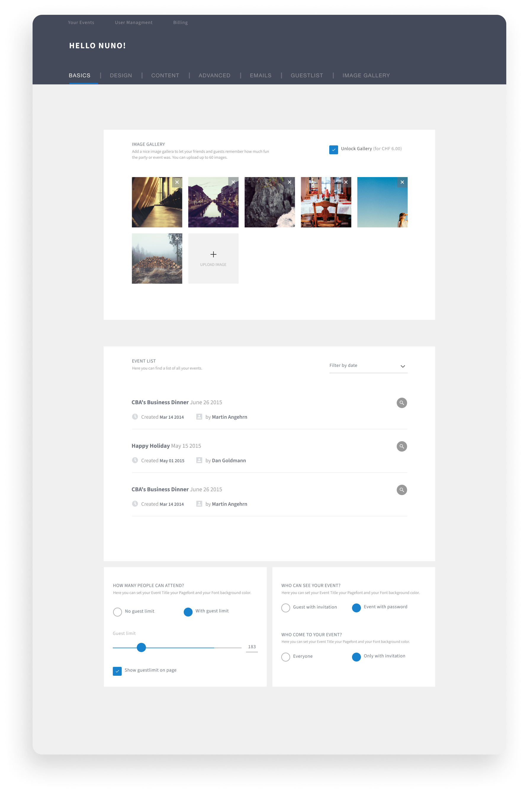 2013 war der Markt für digitale Einladungen noch kaum entwickelt. Bestehende Tools waren entweder verspielt, funktional überladen oder kommerziell getrieben. Eine Anwendung, die Gestaltung, Datenschutz und Usability gleichermassen ernst nimmt, gab es kaum. Das Interface musste gleichzeitig intuitiv, modular erweiterbar und visuell hochwertig sein.
