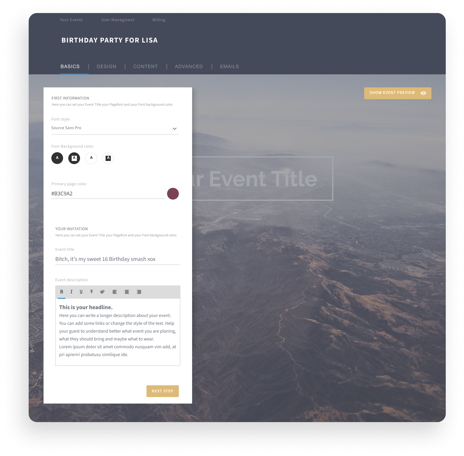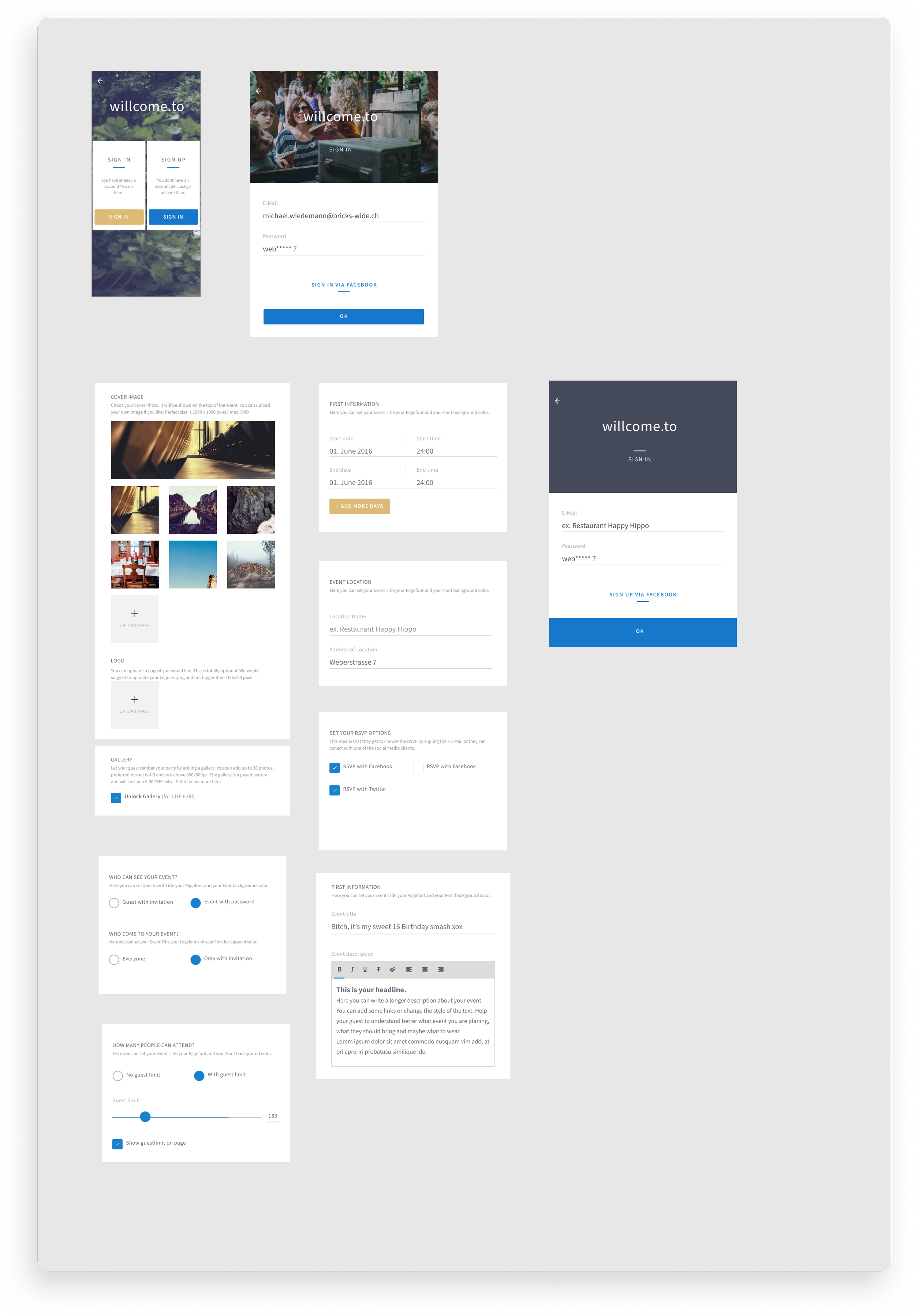 Eine nutzerfreundliche Plattform entwickeln, mit der sich Einladungen zu Events (Geburtstage, Dinner, Partys etc.) einfach, stilvoll und unabhängig gestalten lassen, ohne Agentur, ohne Stress. willcome.to sollte es jedem ermöglichen, Events online zu organisieren, Gäste zu verwalten und gestalterisch aufzuwerten. Das Tool sollte klar, intuitiv, modular und nicht verspielt wirken, sondern wie ein durchdachtes Interface-Produkt.